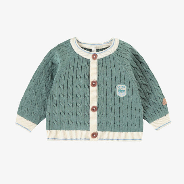 Ashen turquoise knit vest with vertical twists by Souris Mini - 0/3M is backordered and will ship as soon as it is back in stock.