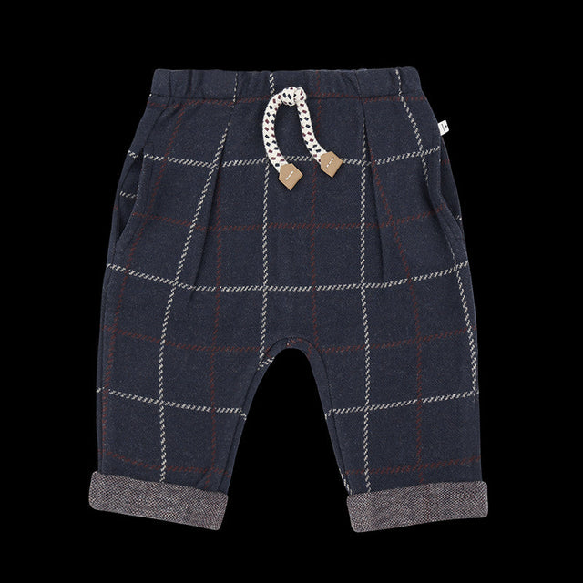 Comfy pants with drawstring closure in a classic plaid pattern.