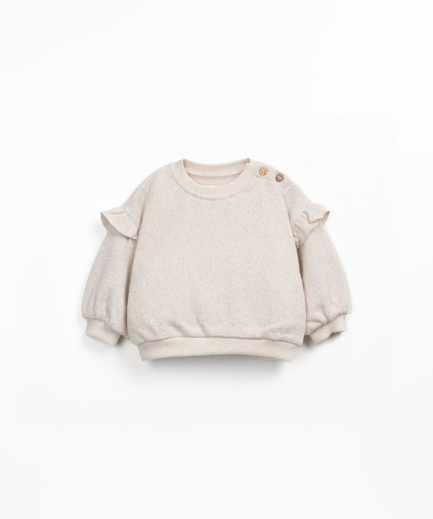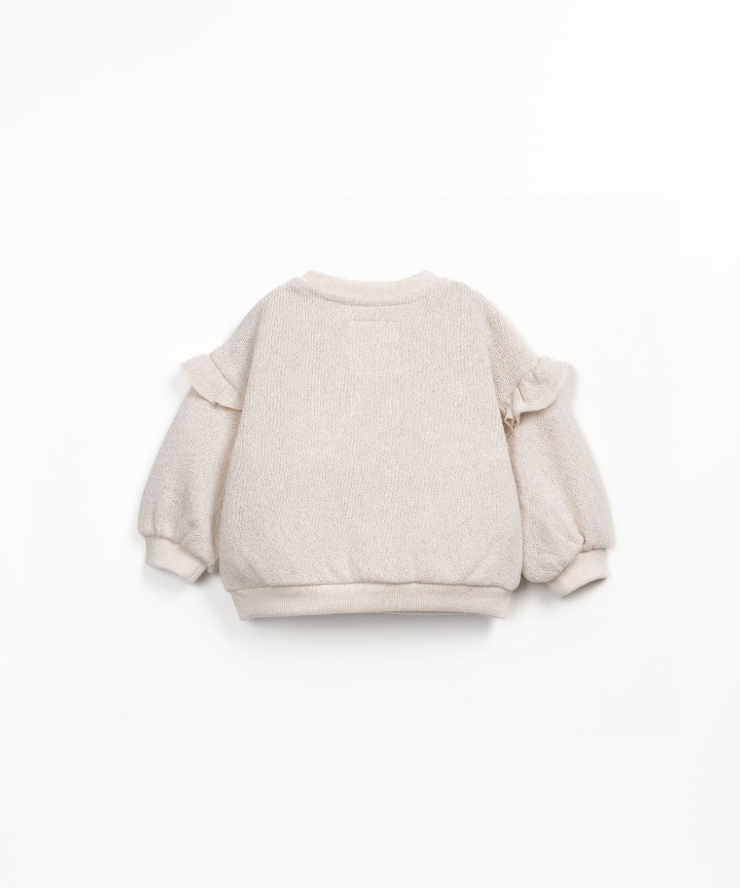 This sweatshirt is made of knit fabric with a blend of regenerative cotton and recycled cotton, in the color Off White. It features a round neckline, elastic cuffs and waistband, frill detail on the sleeves, and a shoulder opening with coconut buttons.