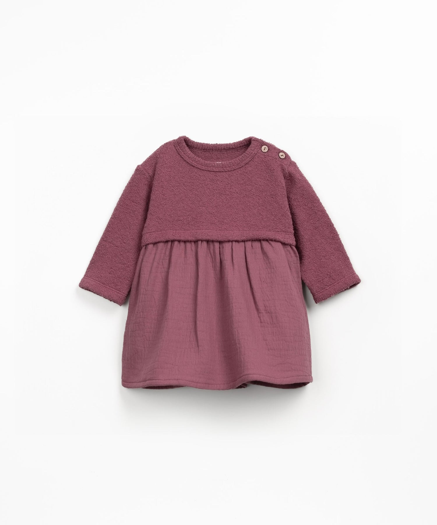 This dress is made from a jersey fabric in a mix of cotton, organic cotton, and regenerative cotton, in Dark Pink color. It features a round neckline, shoulder opening with coconut buttons, and a fitted waist detail.