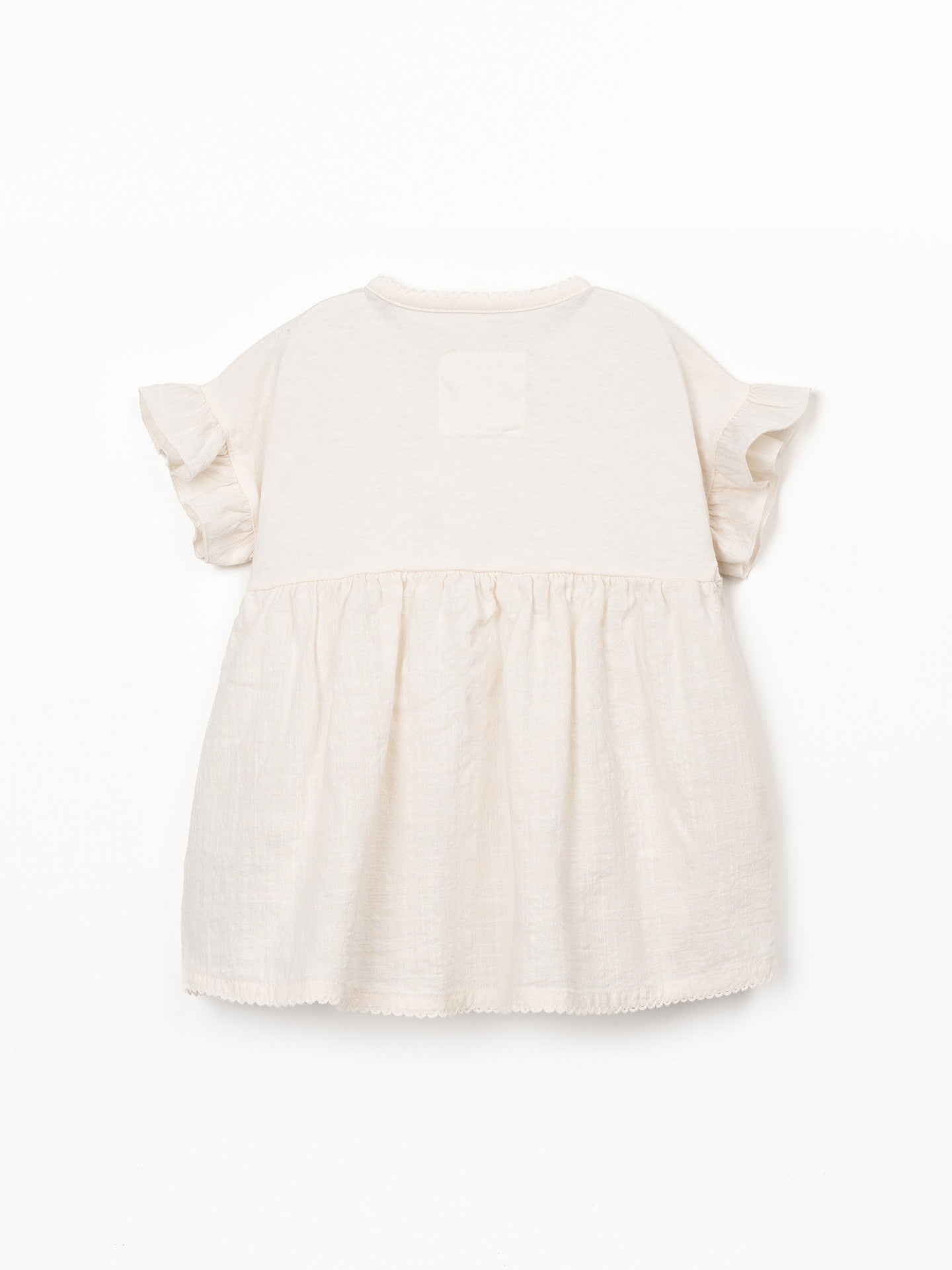 This dress is made from a mix of jersey and fabric in organic cotton and recycled cotton, in Ecru color. It is a model with puff sleeves, round neckline and front opening with coconut buttons.
