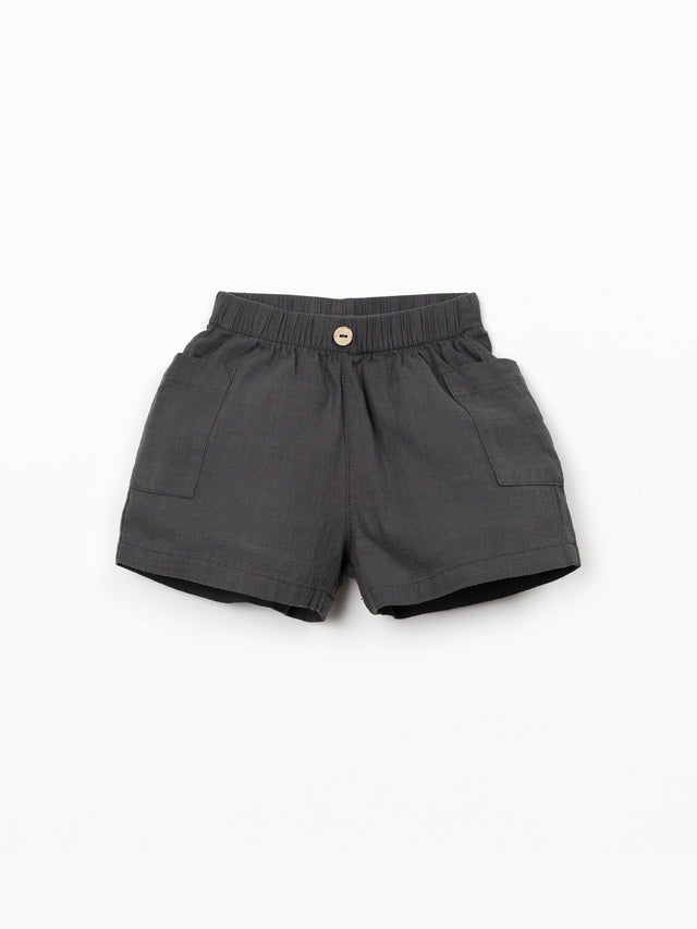 These shorts are made of organic cotton fabric, in Grey color. They feature an elasticated waistband, decorative coconut button, and two side pockets.
