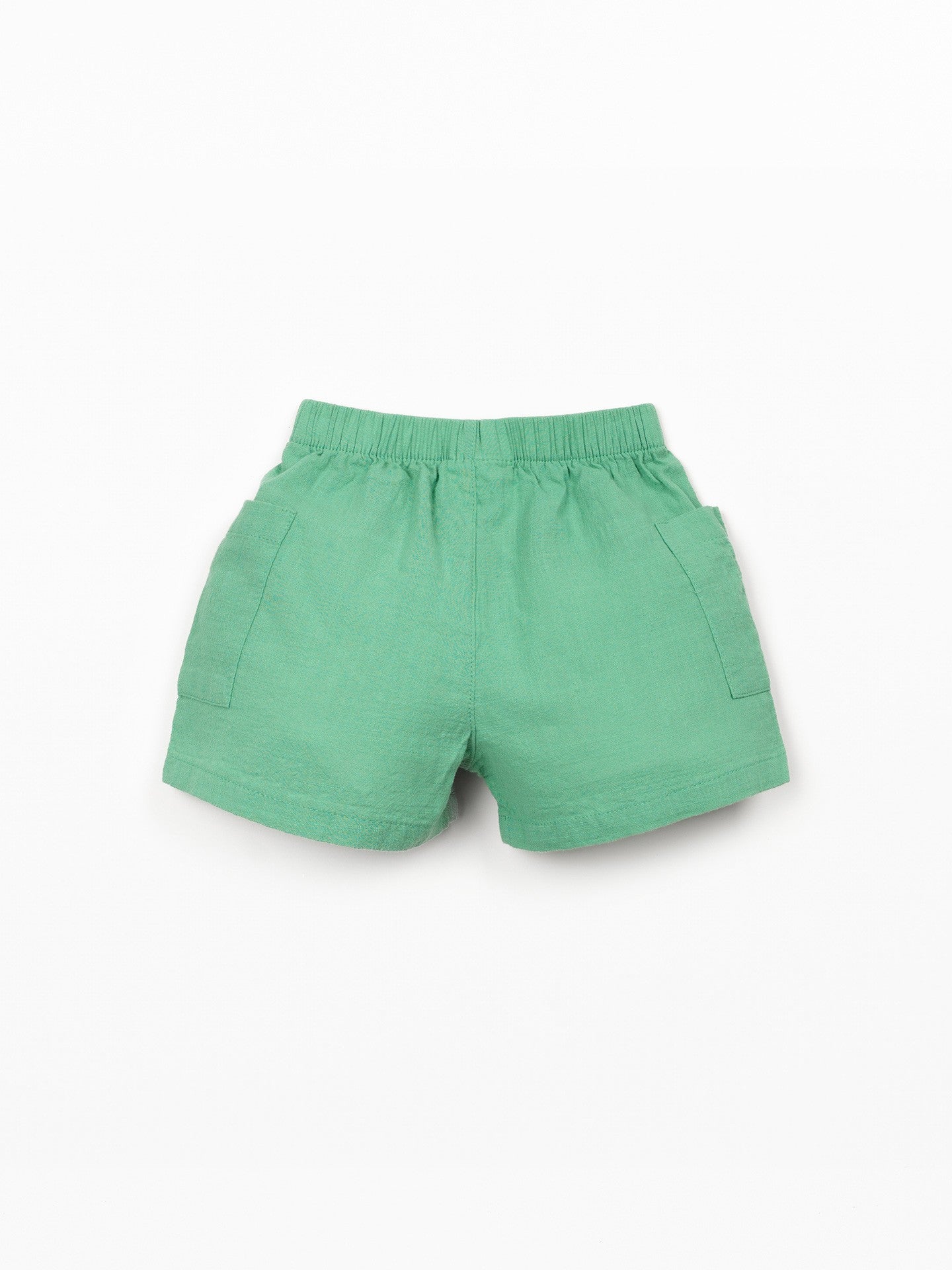 These shorts are made from organic cotton fabric, in Mint Green color. They feature an elastic waistband, a decorative coconut button, and two side pockets.