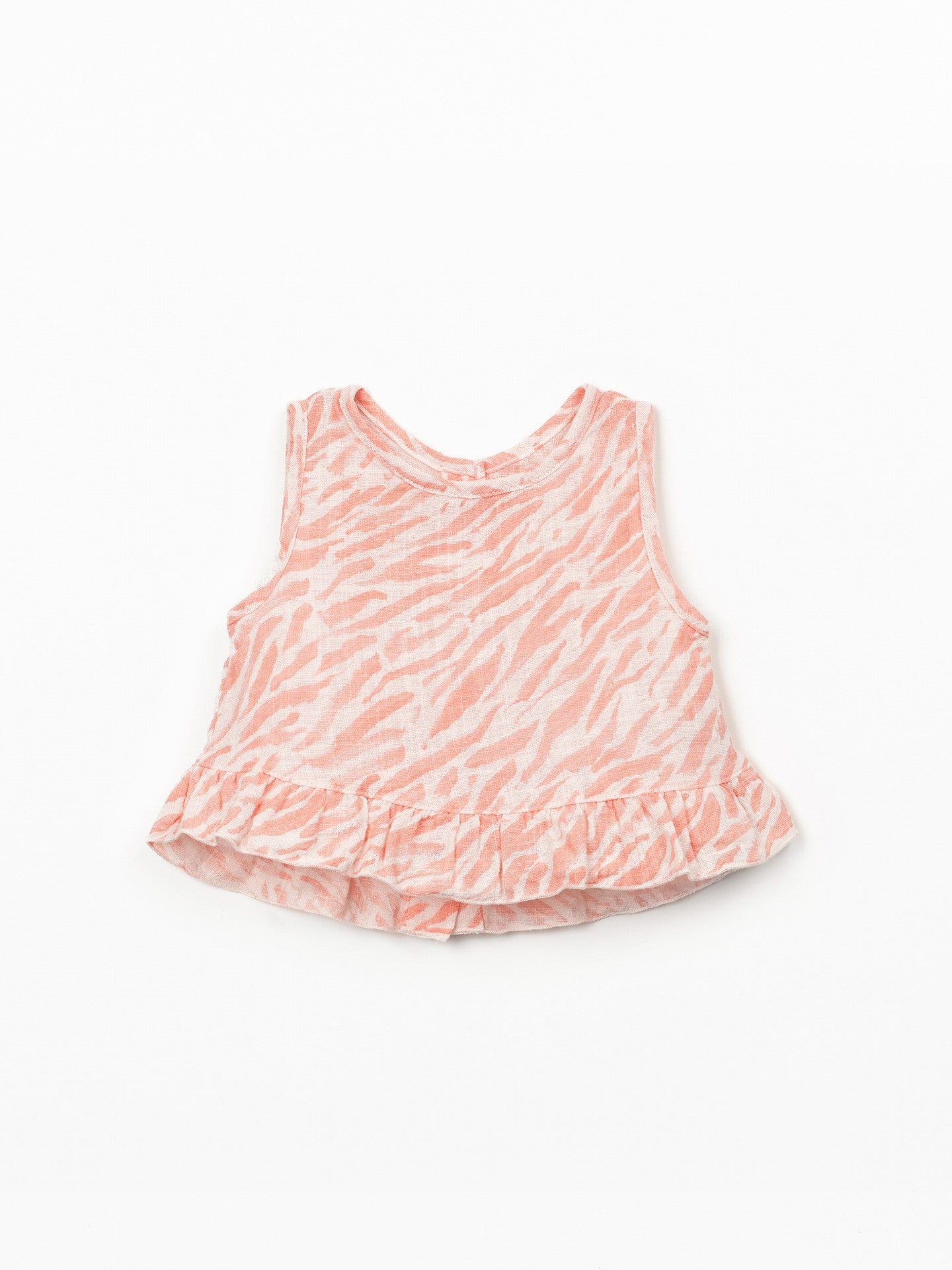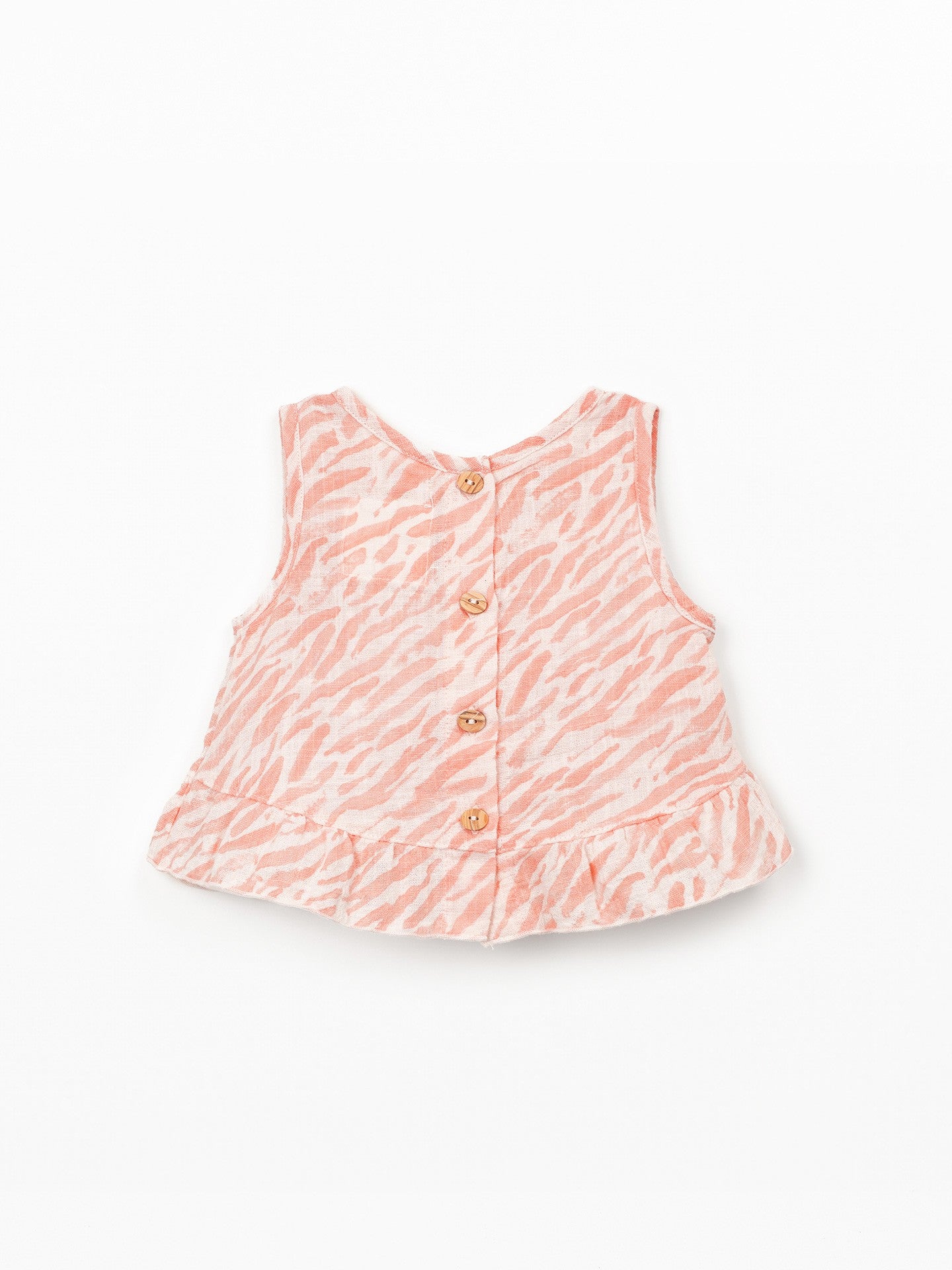 This top is made of organic cotton fabric, in Salmon color. It is a sleeveless model, with a round neckline, back opening with coconut buttons, features a frill insert at the hem and our zebra print.