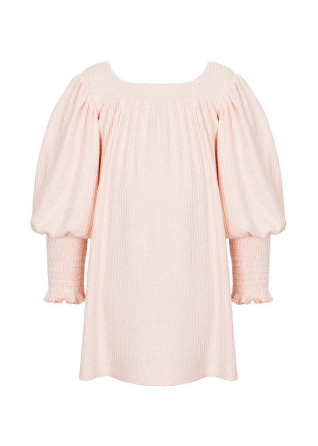 This whisper pink dress is reminiscent of romantic times. The dress features a soft-squared neckline, opening in the back with three delicate buttons. The blouson, smocked sleeves and the softness of the ribbed knit adds to the elegance and simplicity of the dress.