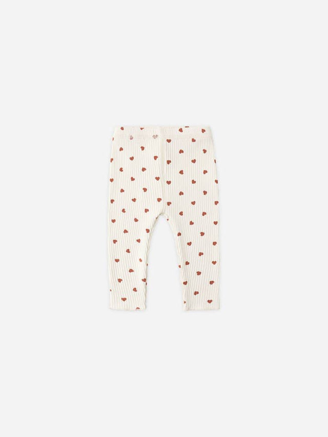 Knit legging in our stretchy rib knit with elastic waistband. Slim fit with added stretch to grow with your baby. Featuring our 'red hearts' print on our ‘natural' hue. Care: Machine wash cold. Lay flat to dry. Made of 95% organic cotton / 5% elastane.