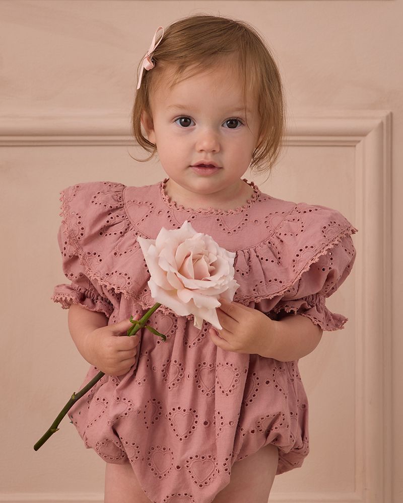 This heart eyelet romper features a lovely frill collar with a lace trim and gathered short sleeves for a truly perfect fit.