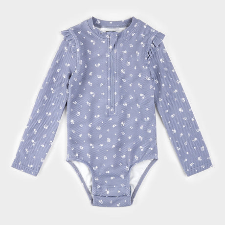 Wildflower Print on Steel Blue Long-Sleeve One-Piece Swimsuit by Petit Lem