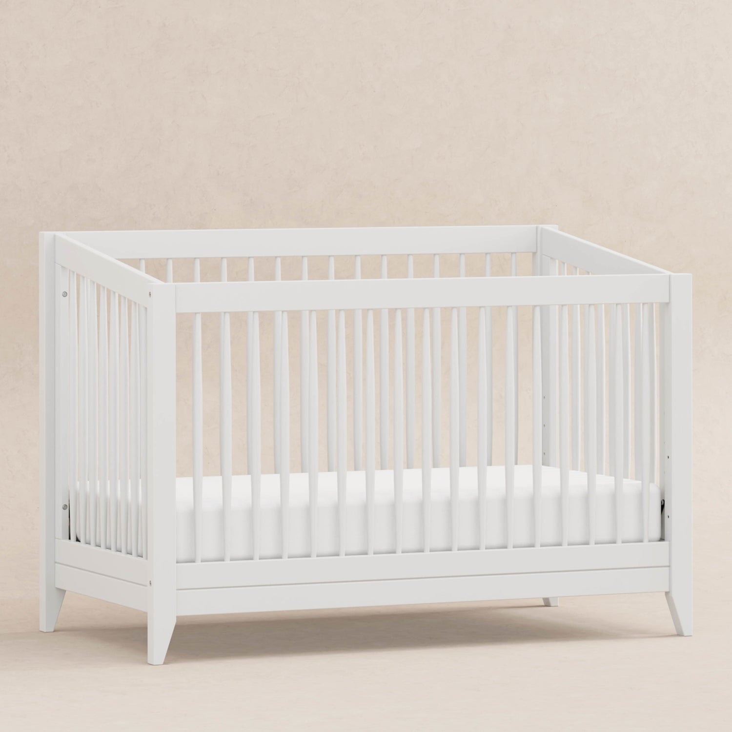 - PLAYFUL TIMELESS DESIGN: Featuring a modern, clean silhouette and classic rounded spindles with a slightly raised back. Flared tapered legs add a playful touch to this sophisticated crib.