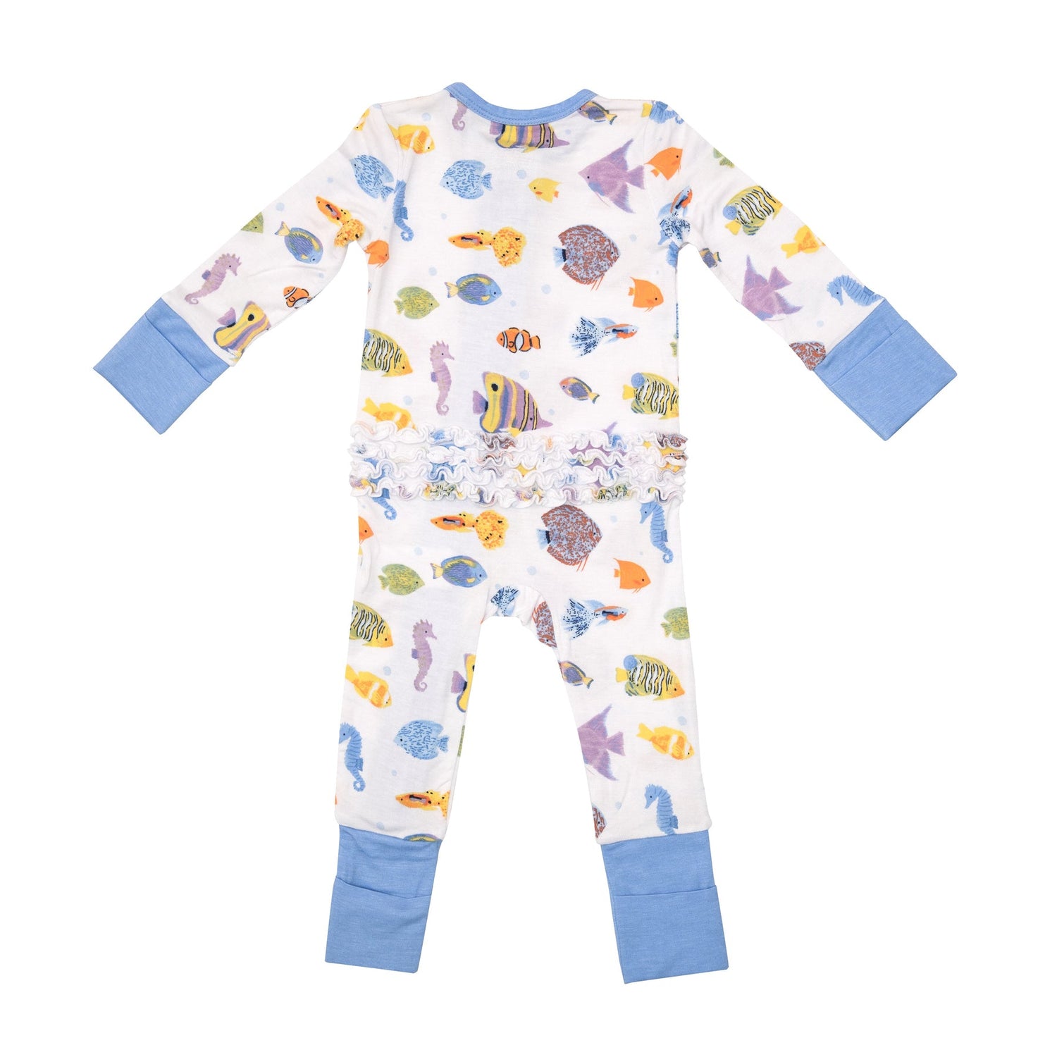 2-Way Ruffle Back Zipper Romper in Tropical Fish by Angel Dear - 0/3M is backordered and will ship as soon as it is back in stock.