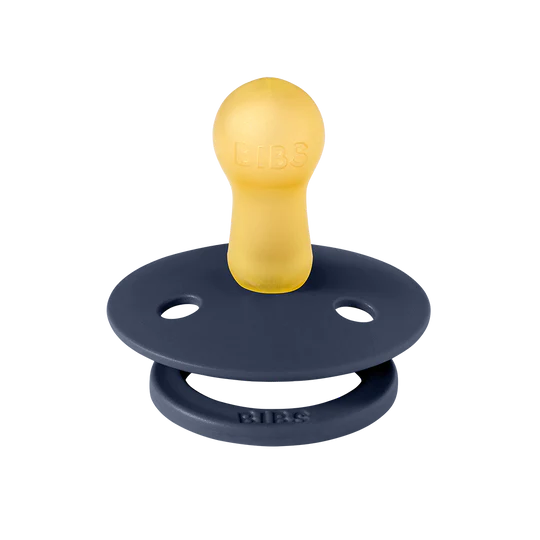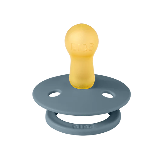 Our Colour pacifier is the original BIBS pacifier and has been on the market for over 40 years. It has the signature round BIBS shield with three vent holes and round BIBS engraved handle ring.