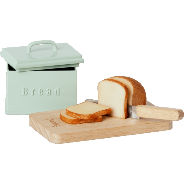 This miniature playset consists of a bread box, half bread and 3 slices, a cutting board, and a knife. It is made of metal, wood, and polyresin. It is the perfect start of a play in the miniature kitchen.