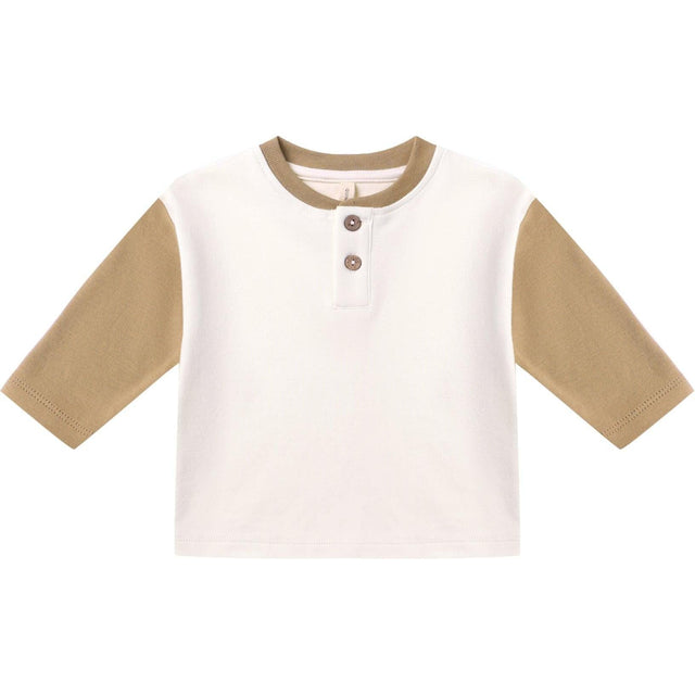 A cozy long sleeve tee with a relaxed fit, featuring contrast sleeves, neckline, and front placket, with soft coconut buttons for easy changes.