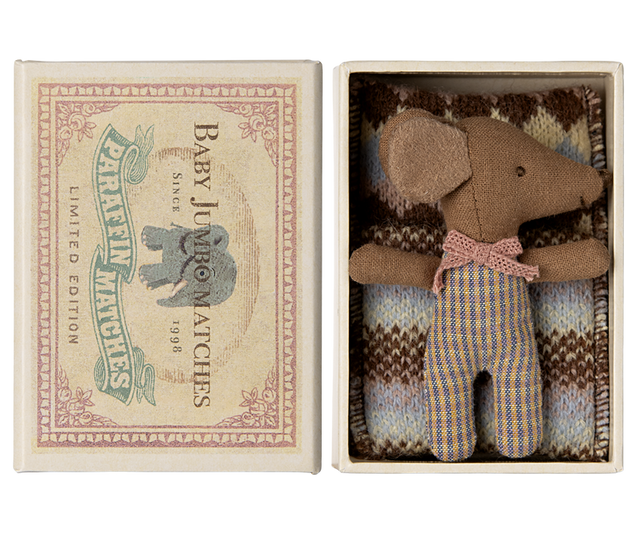 A classic Maileg item. This mouse is ready for hours of play and sleeps tight in the little matchbox. The clothes and bedlinen are made of soft fabrics with unique prints in beautiful colors.