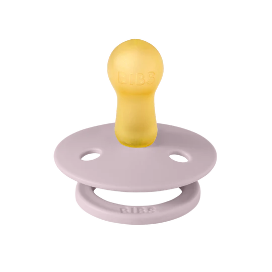 Our Colour pacifier is the original BIBS pacifier and has been on the market for over 40 years. It has the signature round BIBS shield with three vent holes and round BIBS engraved handle ring.