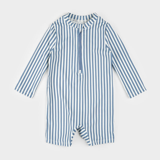 Blue Striped Swim Romper by Petit Lem - 0/3M is backordered and will ship as soon as it is back in stock.