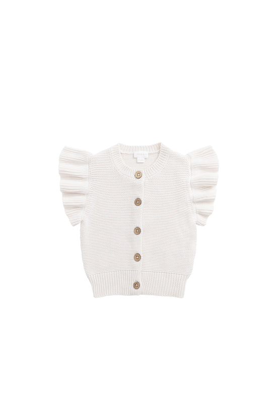 The Elise Vest – Parisian Pink is a beautifully knitted cardigan-style vest in a soft pink hue. Featuring short ruffled sleeves, a round neckline, and five coconut buttons down the front, this piece adds a touch of charm and warmth to any outfit. Perfect for layering over dresses or tops, it’s a versatile addition to your little one’s wardrobe.