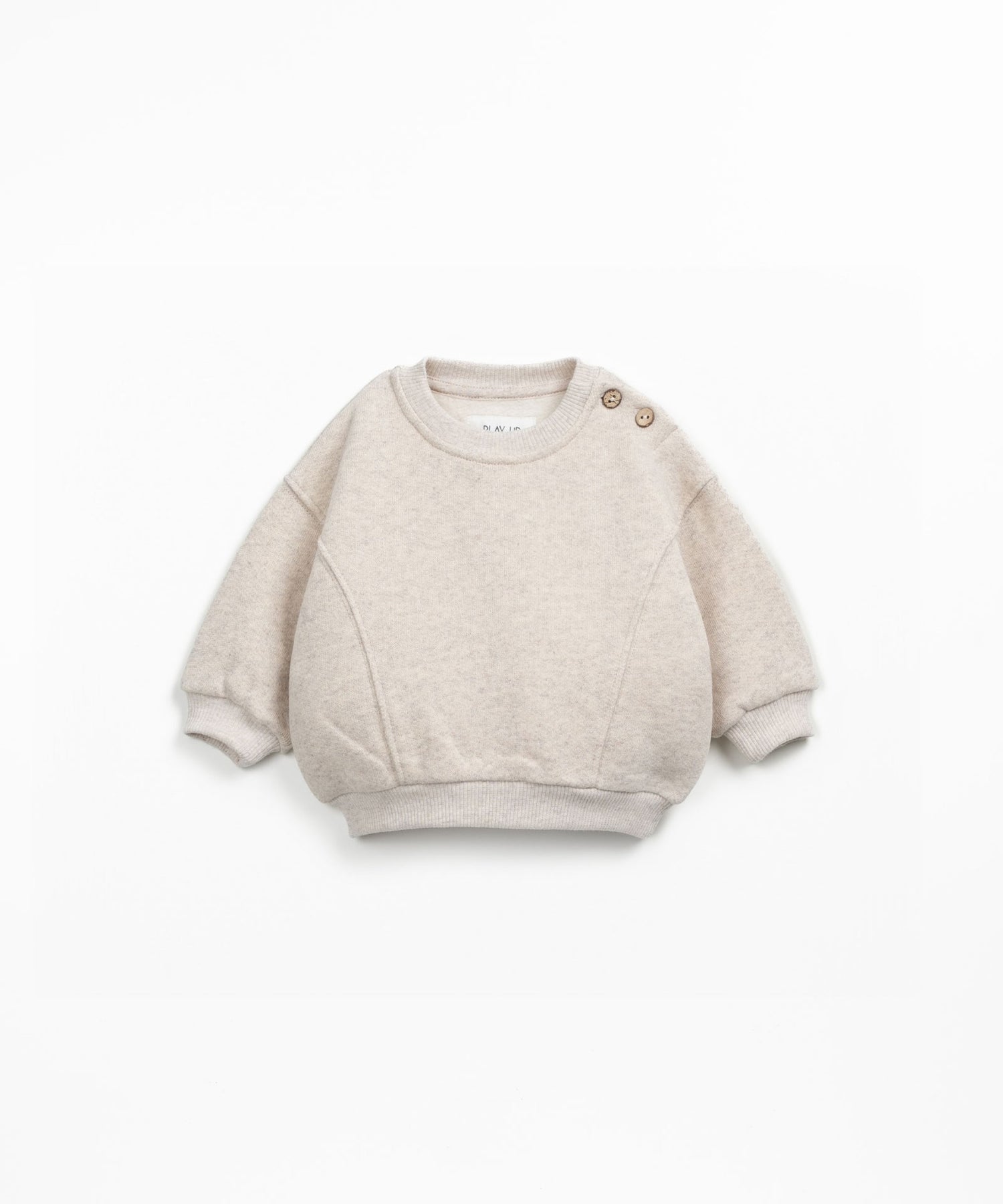 This fleece sweatshirt is made of a knit blend of cotton, recycled cotton, and recycled polyester, in Ecru color. It features a round neckline, elastic cuffs and waistband, and a shoulder opening with coconut buttons.