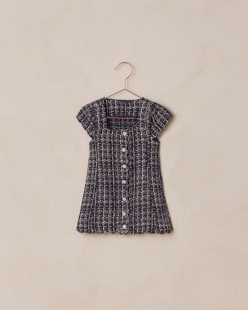 Our Gabrielle Dress brings timeless elegance with its tailored tweed fabric and classic silhouette. Featuring a curved neckline, side zipper, short sleeves, and decorative floral buttons, this charming style is finished with scalloped edges along the placket and hem for an extra-special touch.