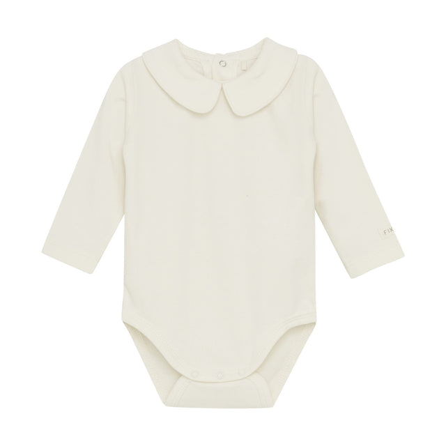 Long-sleeved solid-colored body from FIXONI. The body has a collar and opens with practical snaps in the back and between the legs. Made in a quality that feels soft and comfortable against the skin. Certified acc. to GOTS - organic CERES-0366