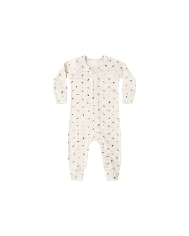 Soft pointelle long john with snaps down the front. Long raglan sleeves and banded sleeve and leg openings keep your little one cozy and warm.