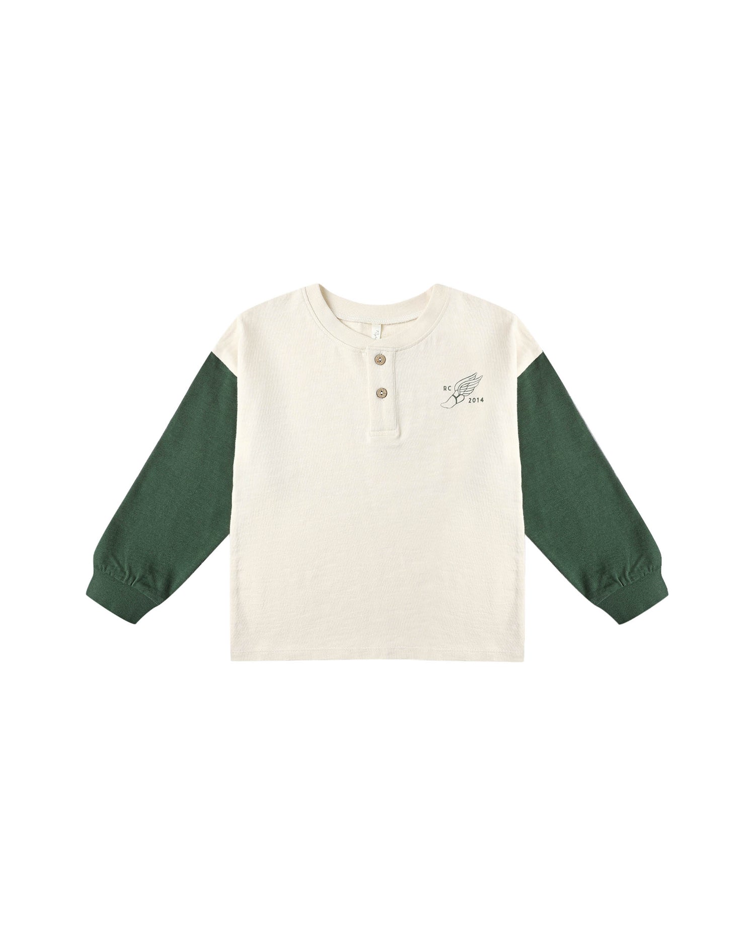 Add vintage track-and-field vibes to your wardrobe with this relaxed-fit long sleeve tee, featuring contrast sleeves and a center front button placket.