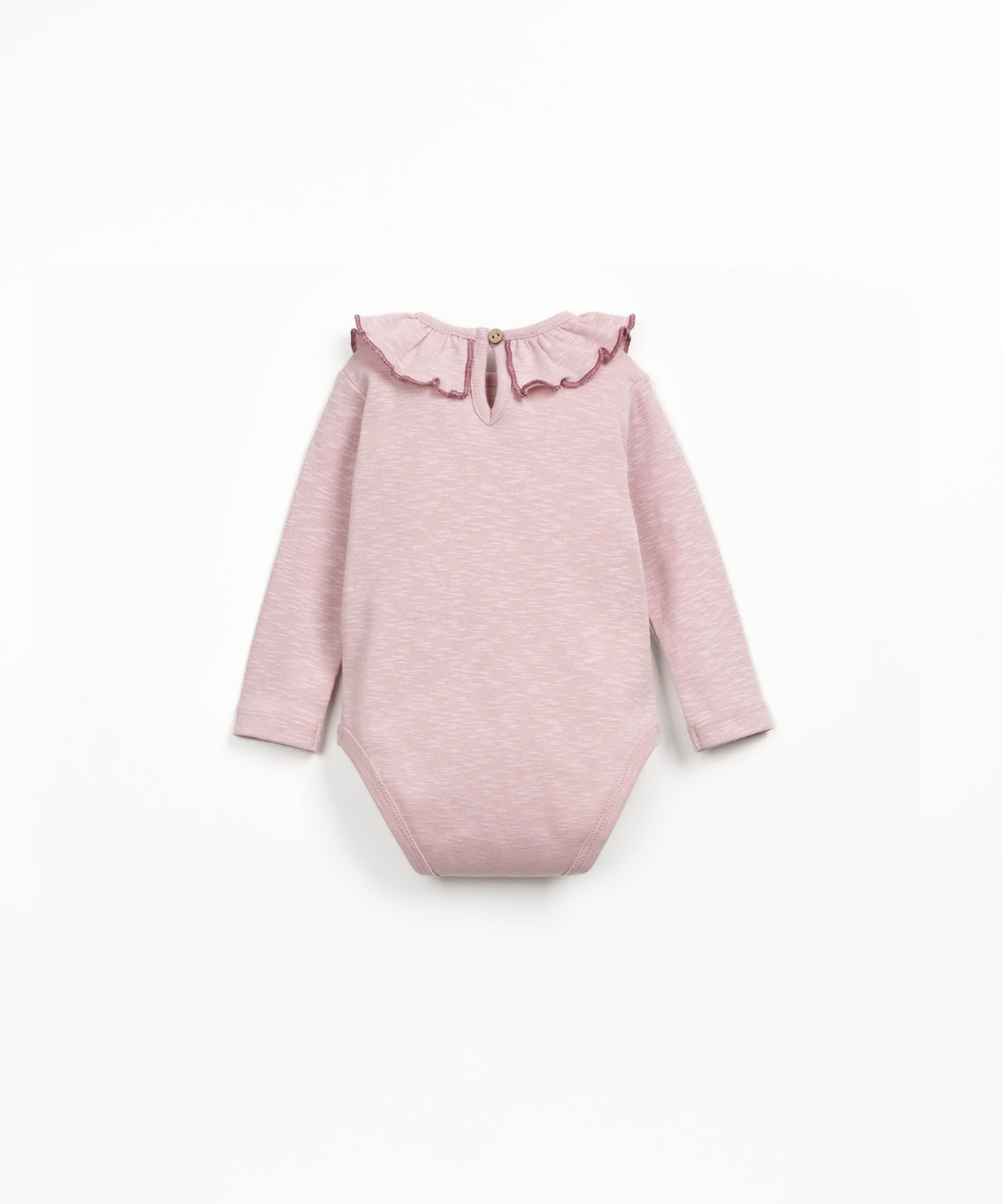 This bodysuit is made of organic cotton jersey, in Light Pink color. It features long sleeves, a frilled collar, and a snap-button opening at the inseam with nickel-free metal buttons.