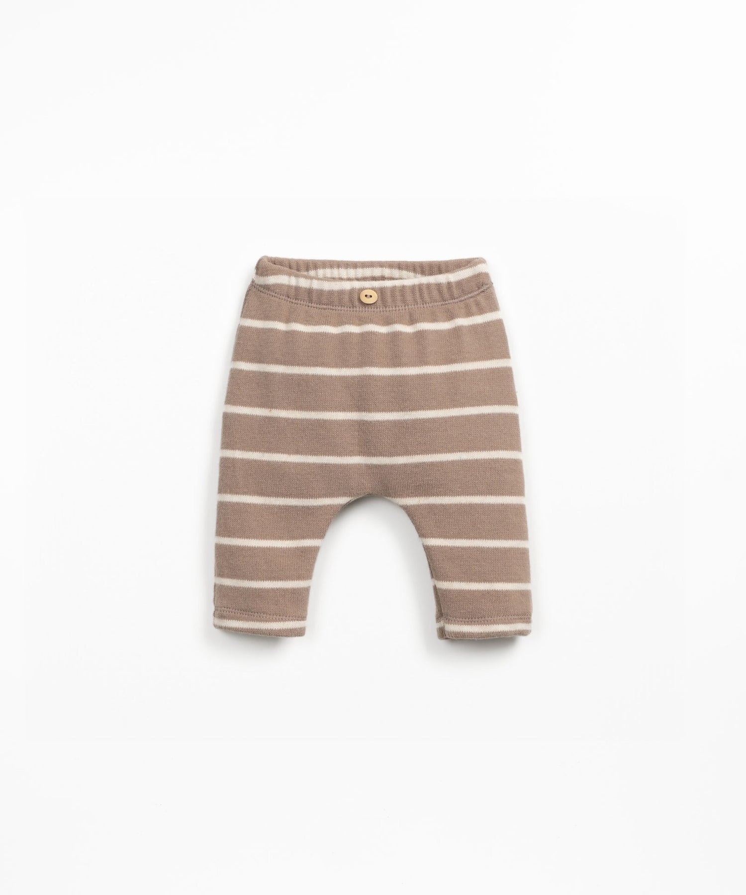 These leggings are made of a knit fabric with a blend of regenerative cotton and recycled cotton, in Dark Pink color. The model features an elastic waistband, a decorative wooden button and a striped pattern.