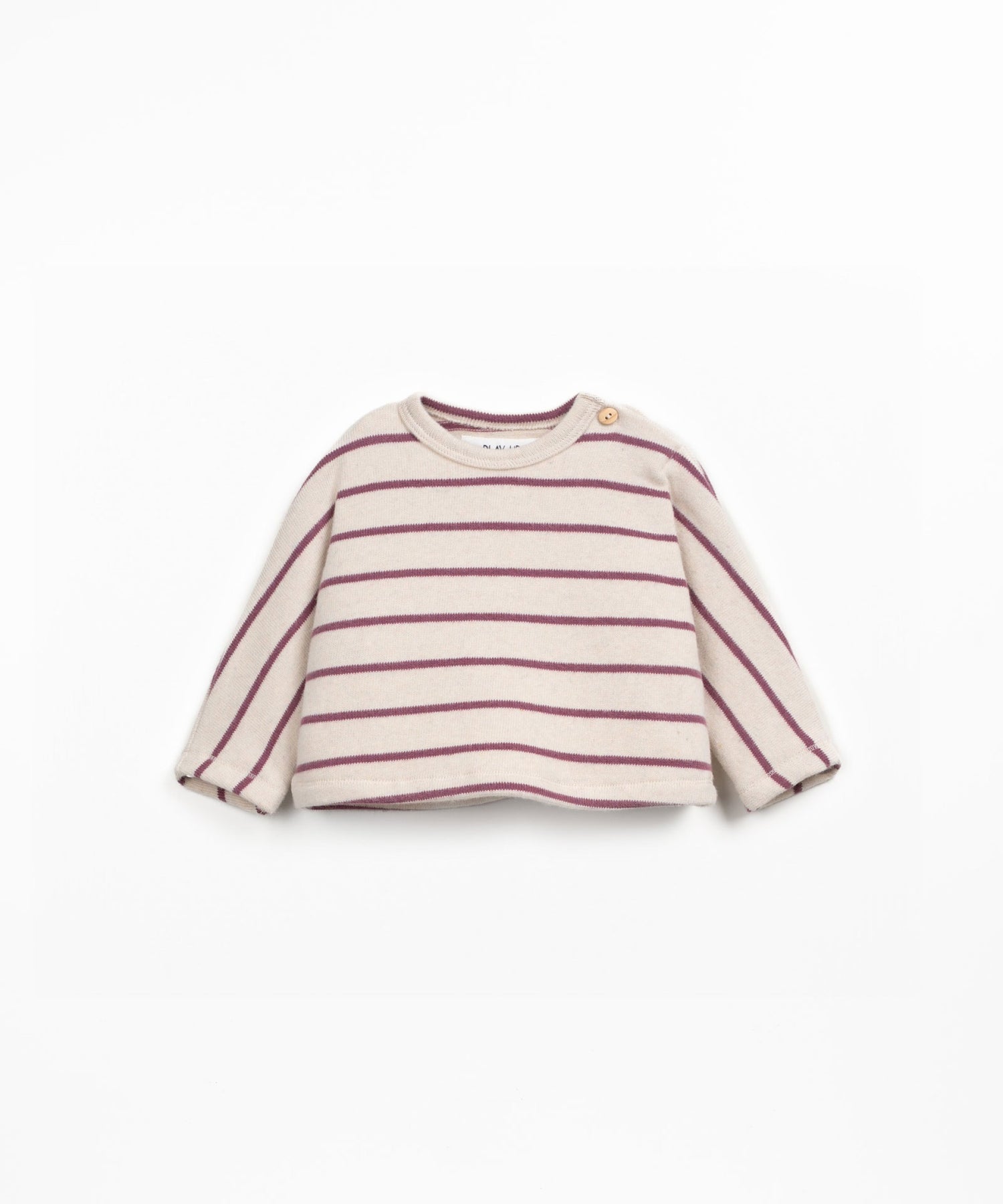 This sweater is made of knit fabric with a blend of regenerative cotton and recycled cotton, in Dark Pink color. It is a long-sleeved model, with brushed interior, round neckline, coconut button opening on the shoulder, and our striped pattern.