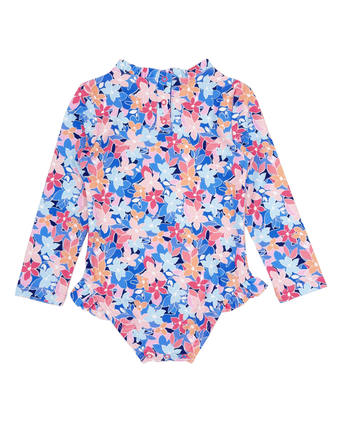 - Long sleeve swimsuit with ruffle detail at leg and neck opening, snaps included at bottom for easy diaper change