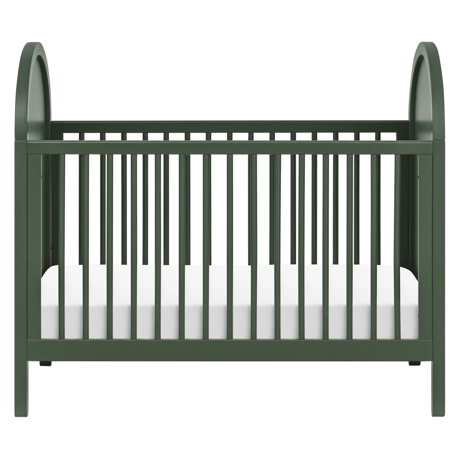 The Bondi Cane 3-in-1 Convertible Crib celebrates boho-inspired design and natural materials with its warm wood tone, playfully arched side panels, curved feet, and woven plant-based cane. The Bondi is designed to grow with your babe using an included toddler bed conversion rail and is screened for harmful chemical emissions to ensure it meets GREENGUARD GOLD Certification.
