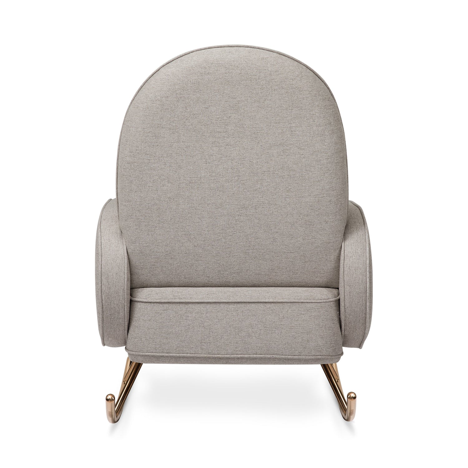 The Compass rocker is at once a study in geometry and a place for luxurious repose as its cushions are plush, yet supportive and its rose gold curved legs ensure a free-flowing rocking. Hand upholstered in smooth eco-performance fabric, that is stain resistant, water repellent, and made with at least 30% recycled materials.