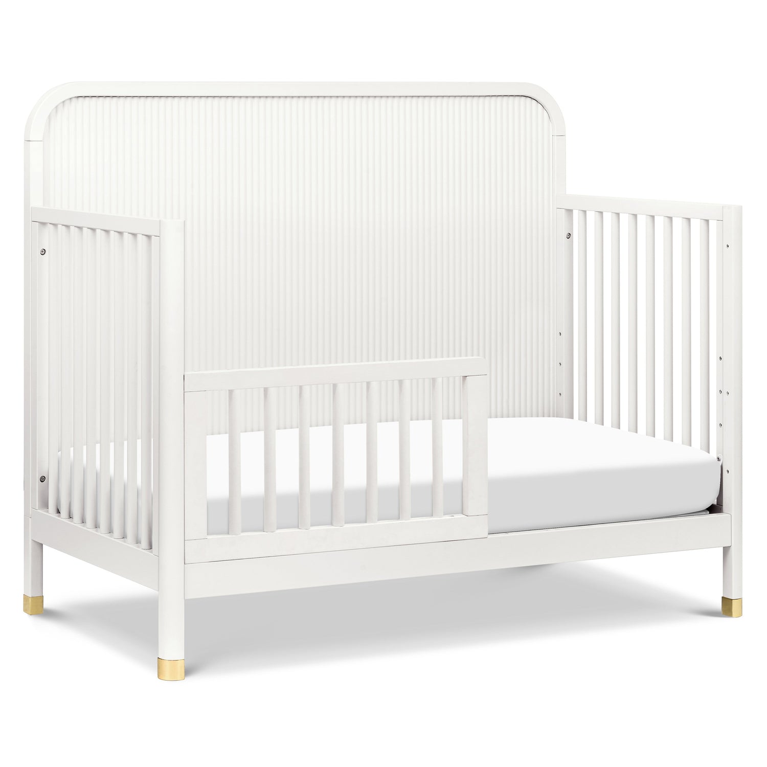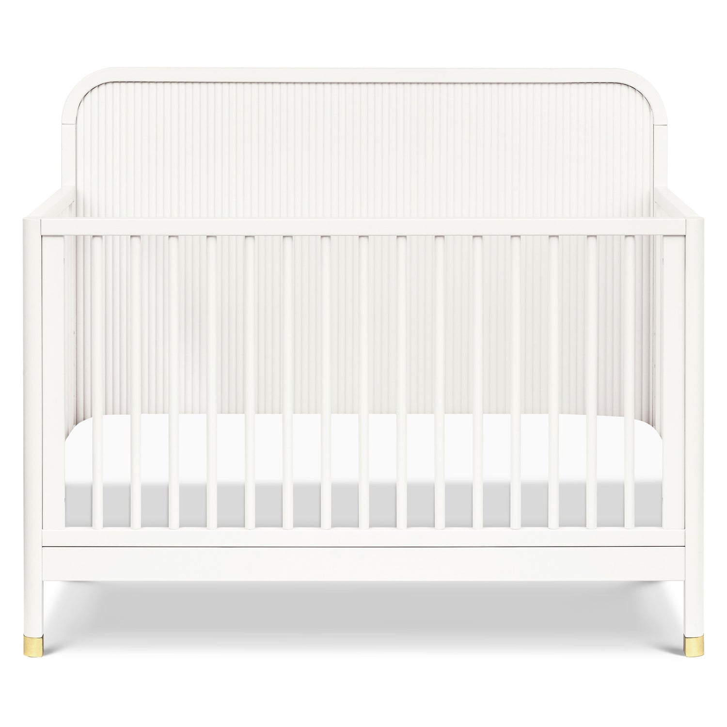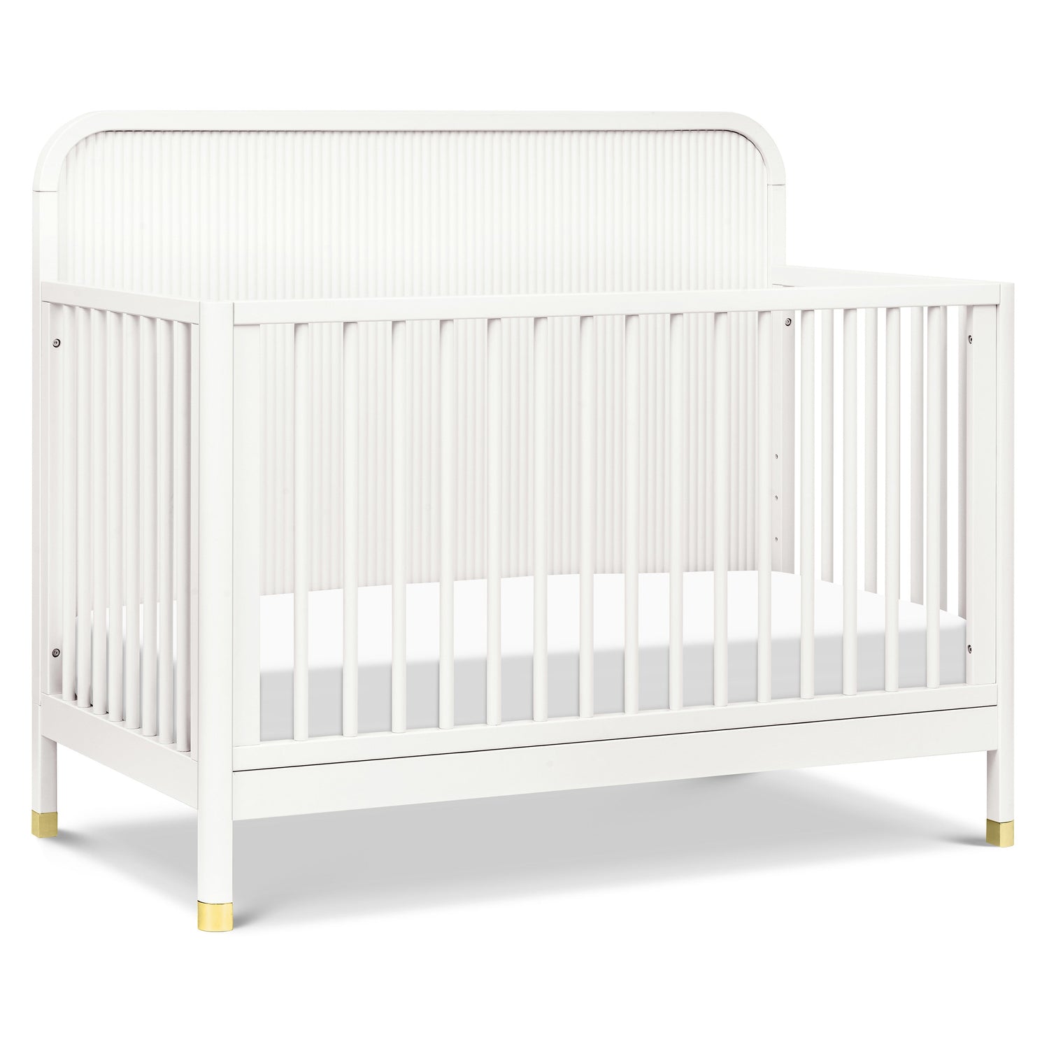 The Brimsley Tambour Crib is a masterpiece of craftsmanship that blends timeless design with modern functionality. Its distinctive tambour design and gently curved slats, paired with elegant gold feet, make this crib more than just a place for your little one to rest; it's a statement piece that elevates the aesthetic of your nursery.