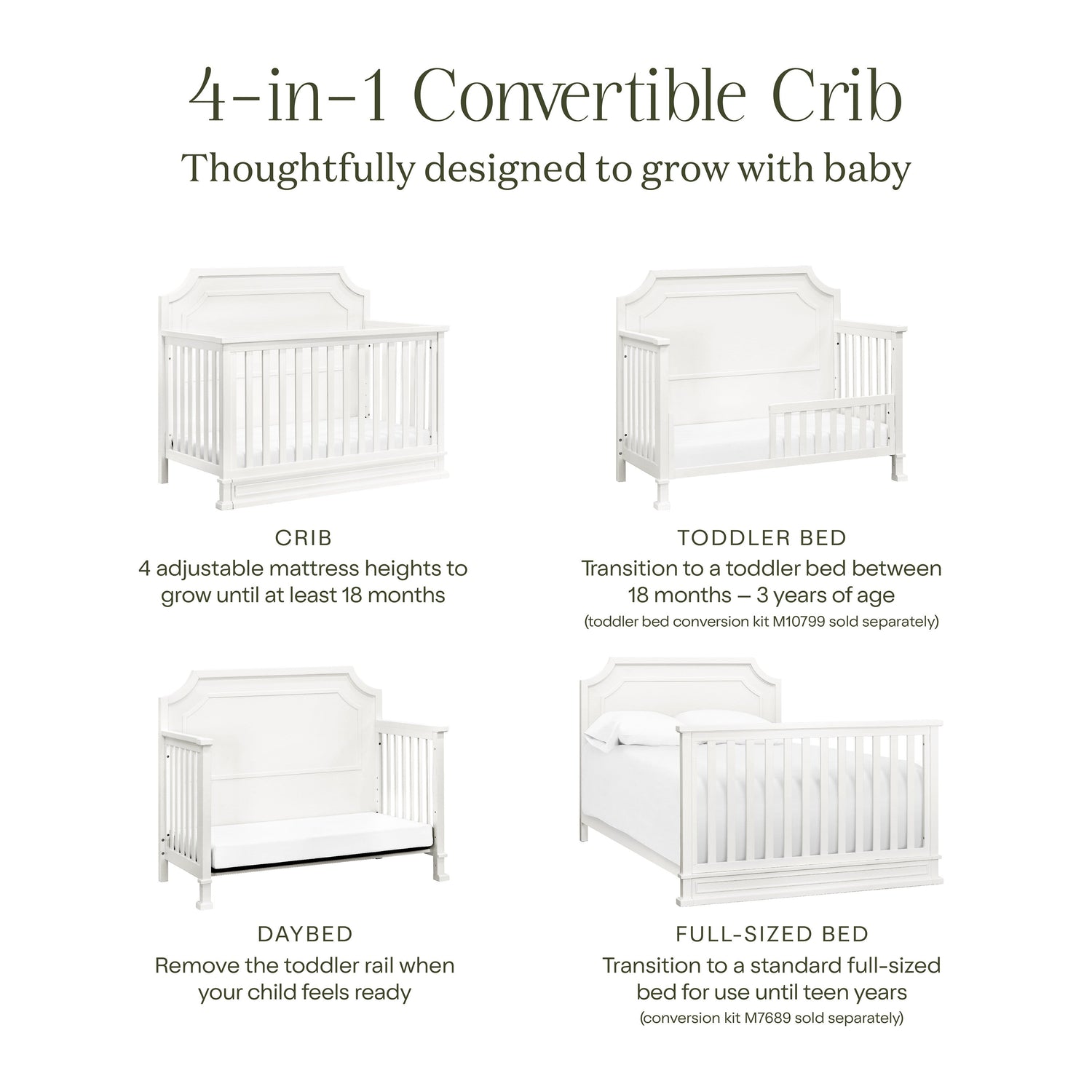 - 4-in-1 CONVERTIBILITY: Our cribs adapt as your baby grows, even in to their teen years. Designed to easily convert to a toddler bed, daybed, and full-sized bed. (toddler bed conversion kit #M10799 and full-size bed conversion kit #M7689 sold separately)