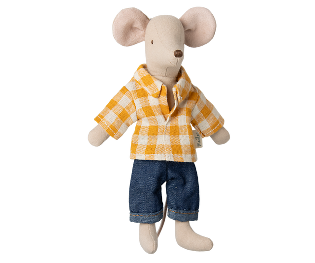 A classic Maileg item; Dad mouse in checked shirt and denim pants. This mouse fits furniture and accessories in size mouse. Buy more clothes separately. Clothes in size mum/dad fits this mouse.