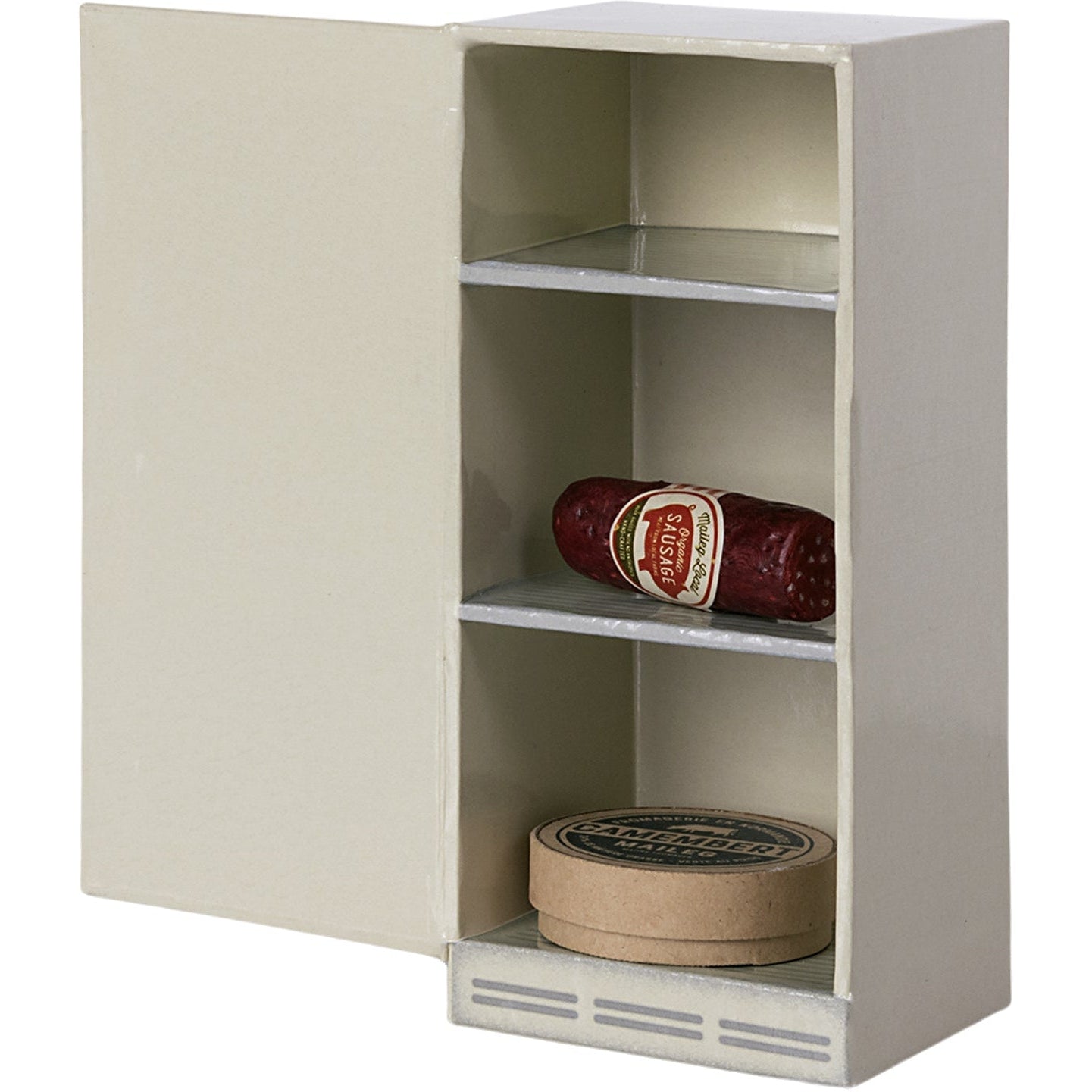 The perfect place to store your groceries so they stay fresh and cold. Inside the cooler, you find a small sausage and cheese. The cooler is made of cardboard and fits perfectly into the mouse castle.