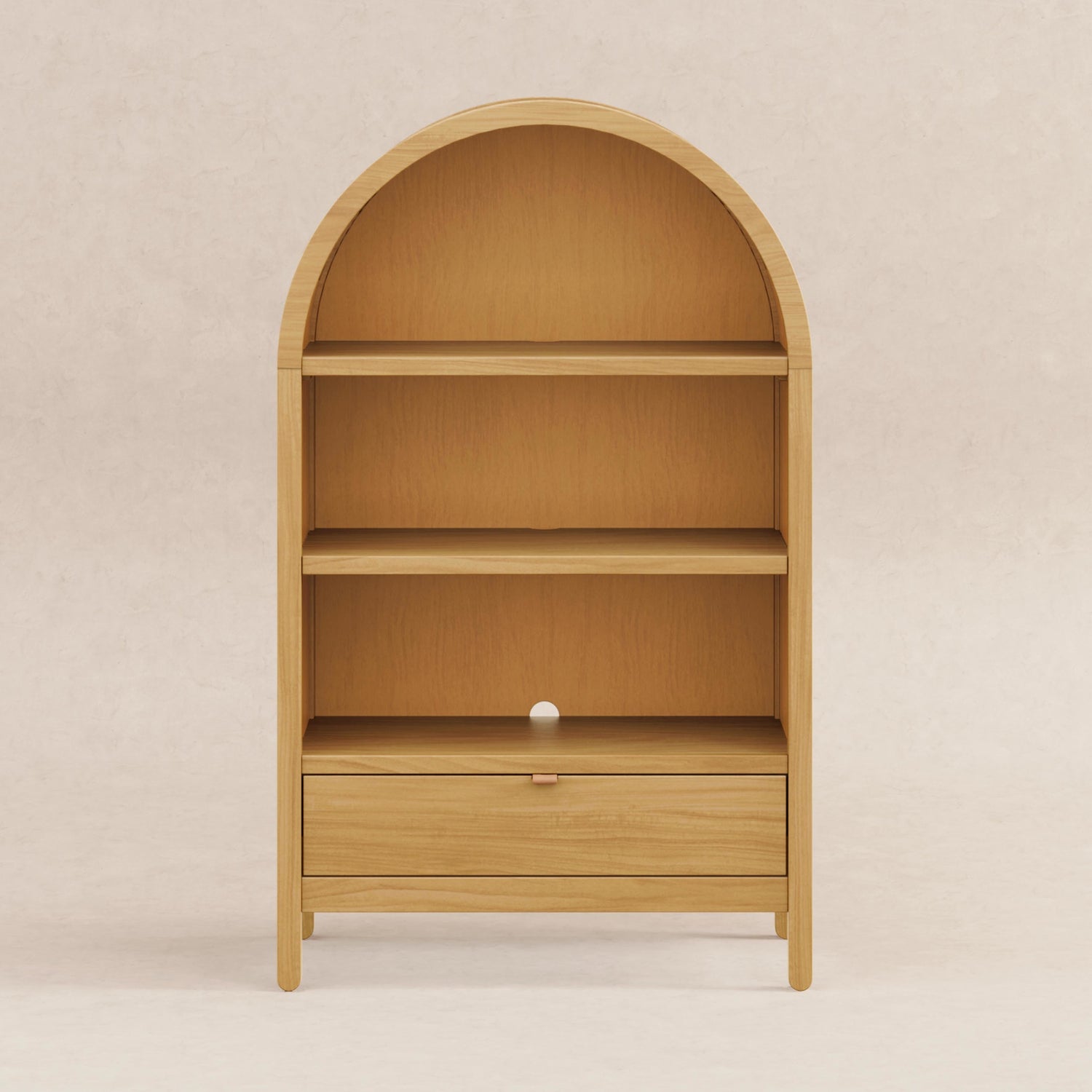 Bring boho charm into your home with the Bondi Assembled Bookcase. Crafted from warm honey-toned wood, this beautifully designed piece brings a natural, airy feel to any room. Featuring three spacious shelves, including one removable and adjustable shelf, you have the flexibility to display your favorite books, toys, and keepsakes. The bottom drawer adds a touch of hidden storage, complete with a luxe vegan leather pull that enhances its organic aesthetic. The Bondi Bookcase blends sturdy construction with natural-looking style, making it a statement piece for both nurseries and big kids' rooms.