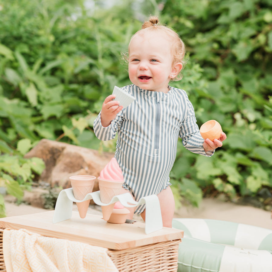 This classic striped bodysuit is a timeless choice for little girls and matches swimwear available for the whole family. With long sleeves, the bodysuit offers extra warmth in chilly waters and protects her delicate skin from the salt or chlorine at summer’s best swimming spots. With a zip down the front, the bodysuit is easy to put on or remove whether wet or dry and sizes newborn up to 2 years have snap buttons at the bottom for mid-play changes. Built-in UPF50+ sun protection means there’s one less thing to worry about when heading out for a day of family fun.