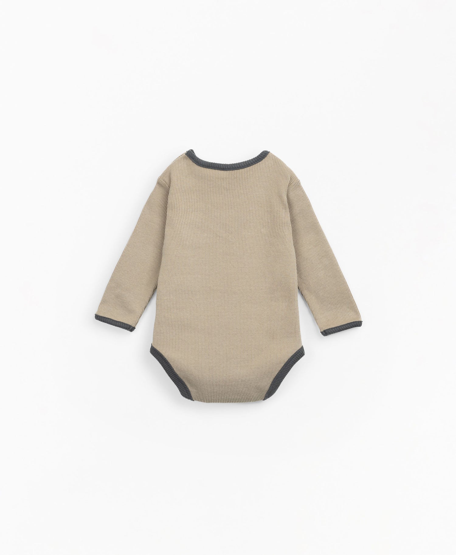 This body is made of ribbed jersey stitch organic cotton, Bruno colour. This model has long sleeves, a round neckline with a contrasting colour detail and a crotch opening with nickel-free metal spring clips.