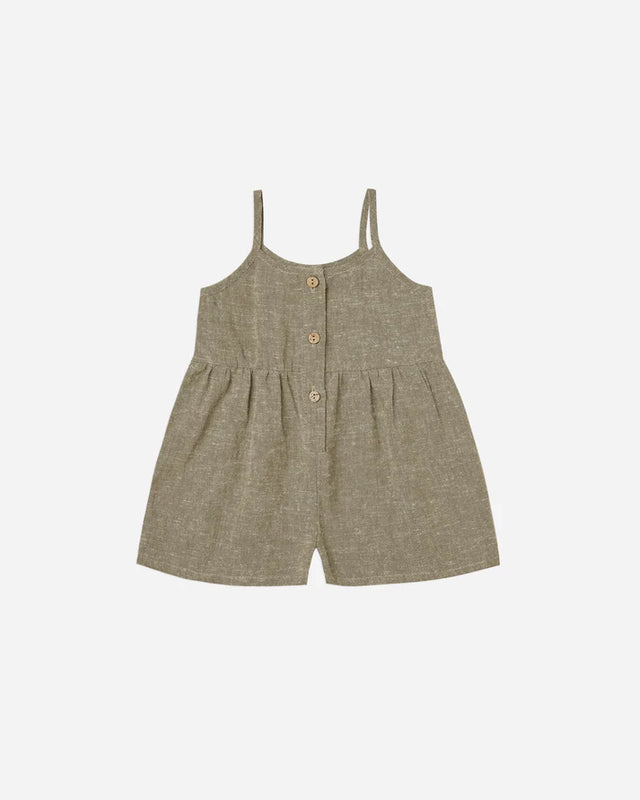Button Romper in Olive by Rylee + Cru - 3/6M is backordered and will ship as soon as it is back in stock.