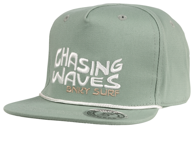 The Chasing snapback hat has all teal/green paneling with an embroidered Chasing Waves BNKY Surf logo on front. This hat is 100% cotton.