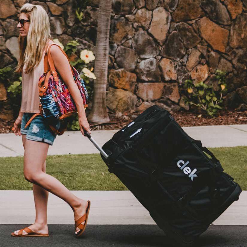 With two rugged wheels, a telescoping handle, luggage ID tag, thick layers of padding for optimal protection, plus a little extra room to stow vacation-extras. When not in use, Clek’s universal car seat travel bag folds flat to fit into any trunk or closet.