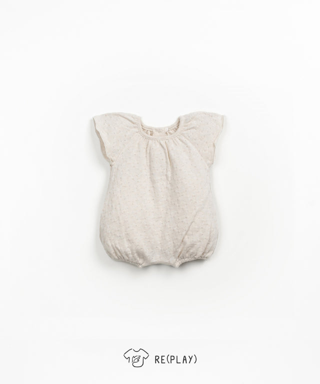 This jumpsuit is made of jersey fabric with a mixture of regenerative cotton and recycled cotton, in Greige color. It features short sleeves, a round neckline, a balloon-shaped fit, a back opening with coconut buttons, and a crotch opening with nickel-free metal snaps. In this collection we have integrated our ?Re(Play)? yarn, made from the recycling of our post-industrial waste.