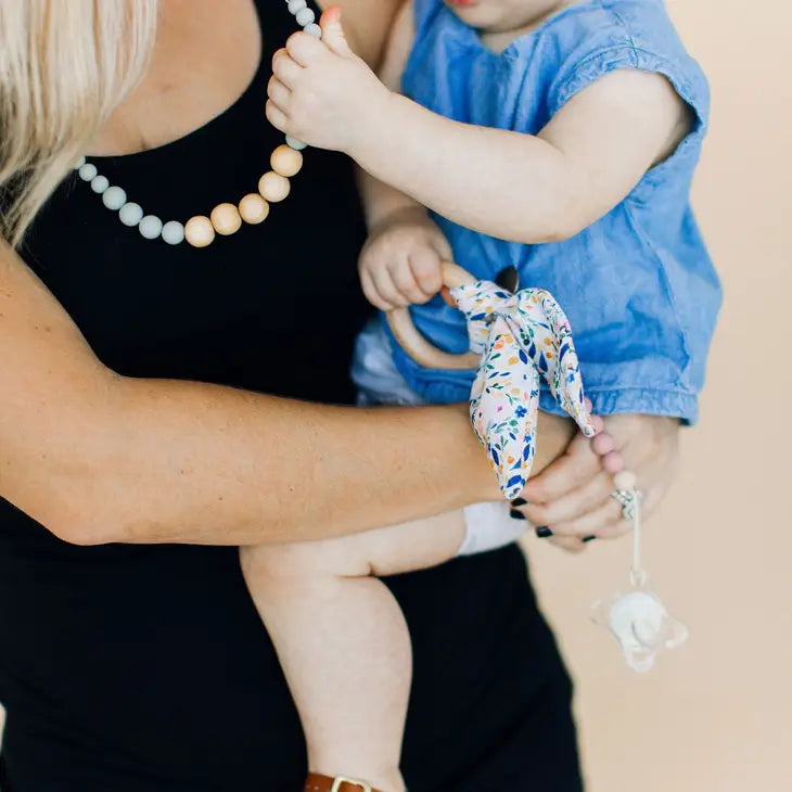 Crinkle Bunny Ears Teether in Floral by Chewable Charm is backordered and will ship as soon as it is back in stock.