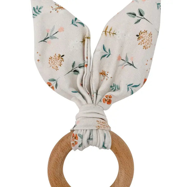 Materials: - Cotton Jersey Knit fabric with a sensory crinkle paper between the fabrics. - Beechwood Ring