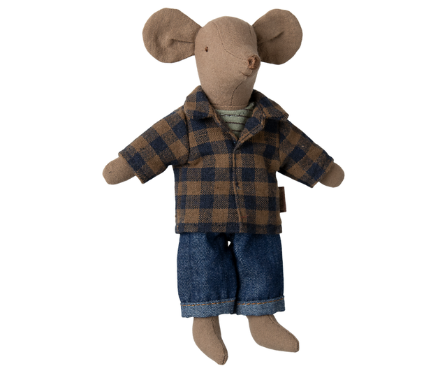 Dad mouse in light brown body fabric. He wears a checked shirt, tank top and denim pants. This mouse fits furniture and accessories in size mouse. Buy more clothes separately, clothes in size mum/dad fits this mouse.