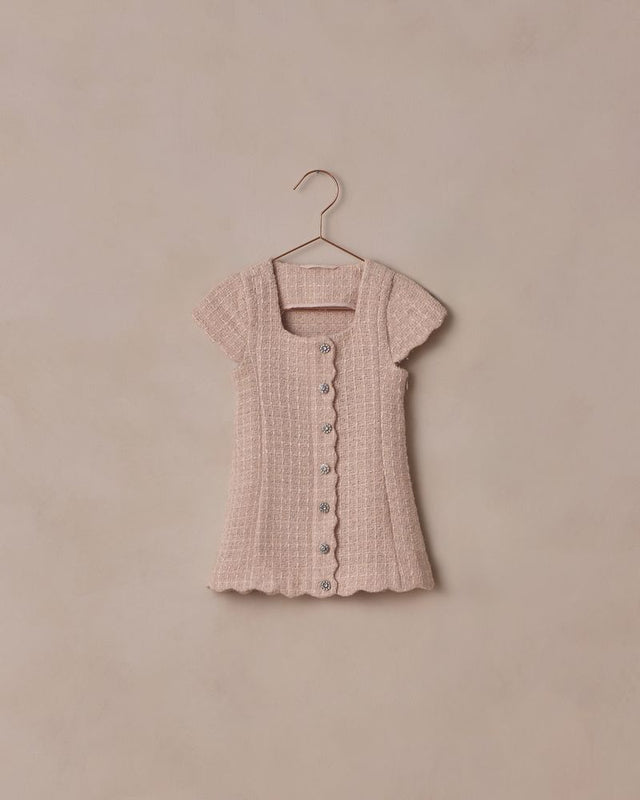 Our Gabrielle Dress brings timeless elegance with its tailored tweed fabric and classic silhouette. Featuring a curved neckline, side zipper, short sleeves, and decorative floral buttons, this charming style is finished with scalloped edges along the placket and hem for an extra-special touch.