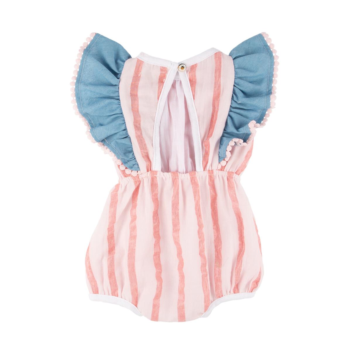 Unleash your inner mermaid with the Isla Bubble Topanga! This bubble romper boasts a mesmerizing pink lurex stripe, delicate chambray ruffles, and playful crochet pom pom trim. Perfect for those who want to stand out and have fun in the sun!