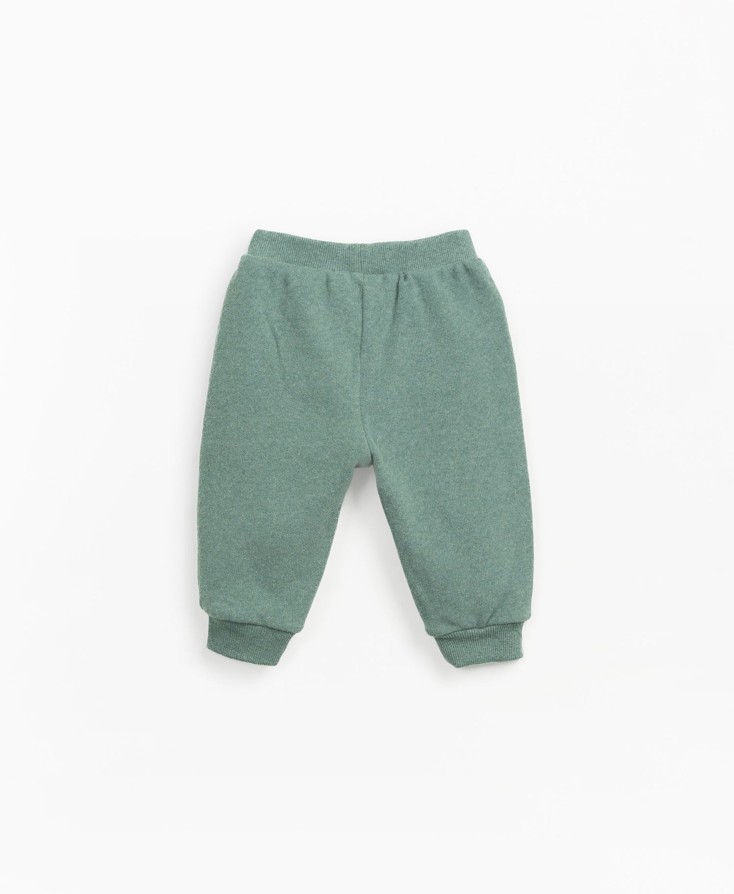 These jersey-stitch leggings are made of a mixture of organic cotton and cotton, Minho Melange colour. This model has a fleece interior, an elastic waist and hems and a kangaroo pocket.
