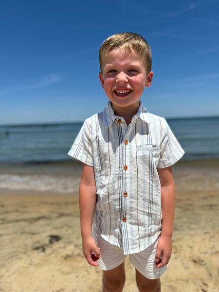The navy, blue and white stripe woven shirt is the perfect mix of fun and style for your little one!